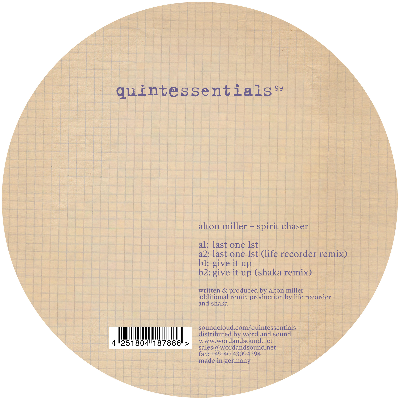 Before celebrating its 100th release Quintessentials is very happy to present another ep from Detroit’s finest Alton Miller (in fact it’s his 4th for the label)! „Last one 1st“ is a driving and building Detroit inspired track that doesn’t lack elegance. The remix courtesy of french hot shot Life Recorder (check out his full EP on Quintessentials as well) focuses on a proper Detroit House vibe call it a classic. The b-side is deeeeep! The original version of „give it up“ is a smooth and soulful tune providing goose bumps. Switzerland’s finest house producer Shaka adds some club feel to a beautiful early morning track. Classic release!