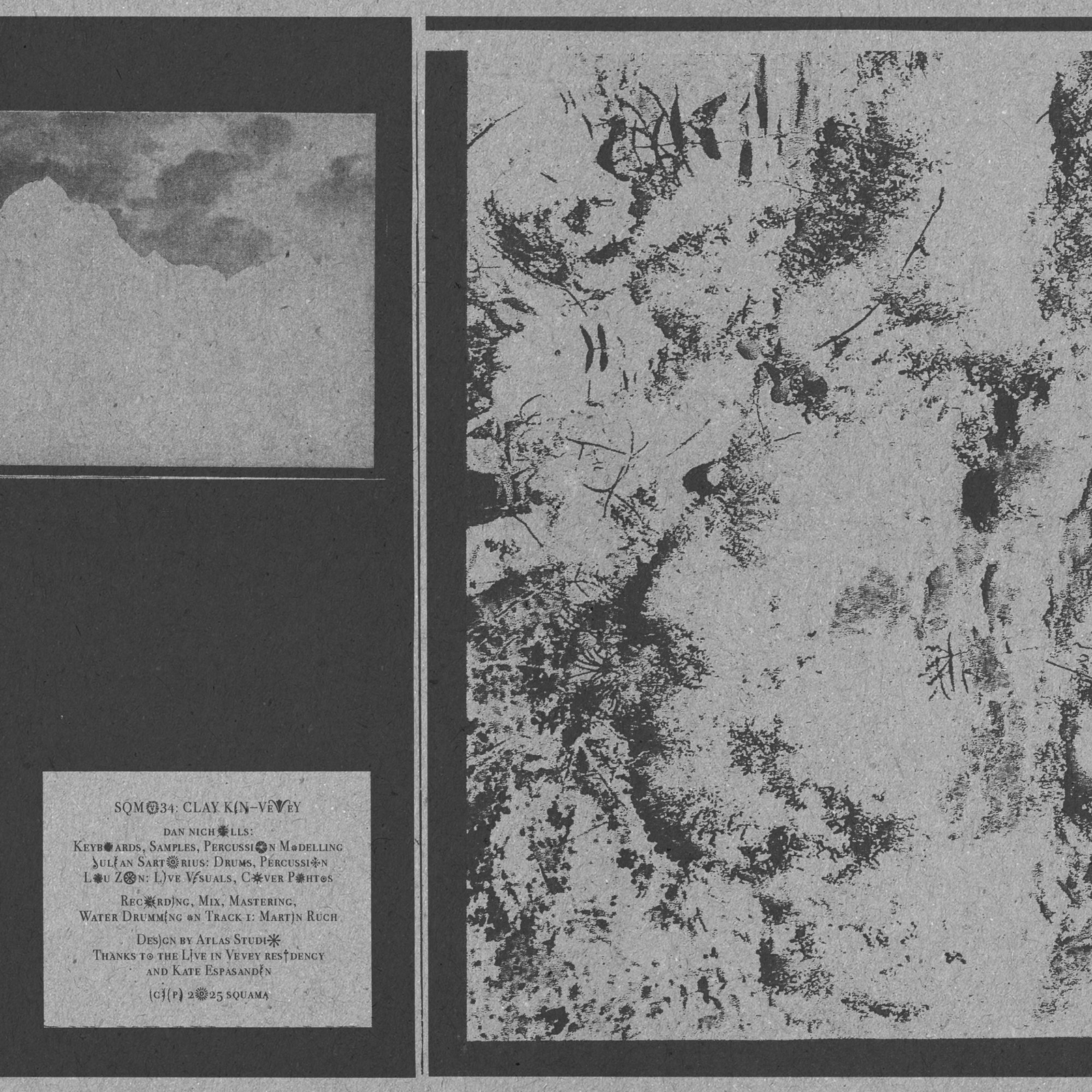 Swiss percussionist Julian Sartorius and UK electronic artist Dan Nicholls team up as Clay Kin presenting their debut record on Squama. They had never planned to make an album yet through pure improvisation and spontaneity Clay Kin have crafted Vevey. An album of seven tracks distilled from over seven hours of improvised percussion and electronics. Recorded mostly outdoors––on pedalo boats up mountains and deep in forests near the namesake Swiss town of Vevey it is imbued with the soft fascination of birdsong rushing water and chattering children. Vevey resists genre. As musicians Sartorius and Nicholls bridge the divide between acoustic and electronic soundscapes. Sartorius’ raw organic percussion interweaves with Nicholls’ keyboard-triggered samples and harmonic landscapes creating a dialogue where the lines between rhythm melody and noise dissolve. Clay Kin identify their outfit as an audio-visual collective with visual artist Lou Zon (Louise Boer) rounding out the group creating videos to accompany both the recorded music and the live experience.