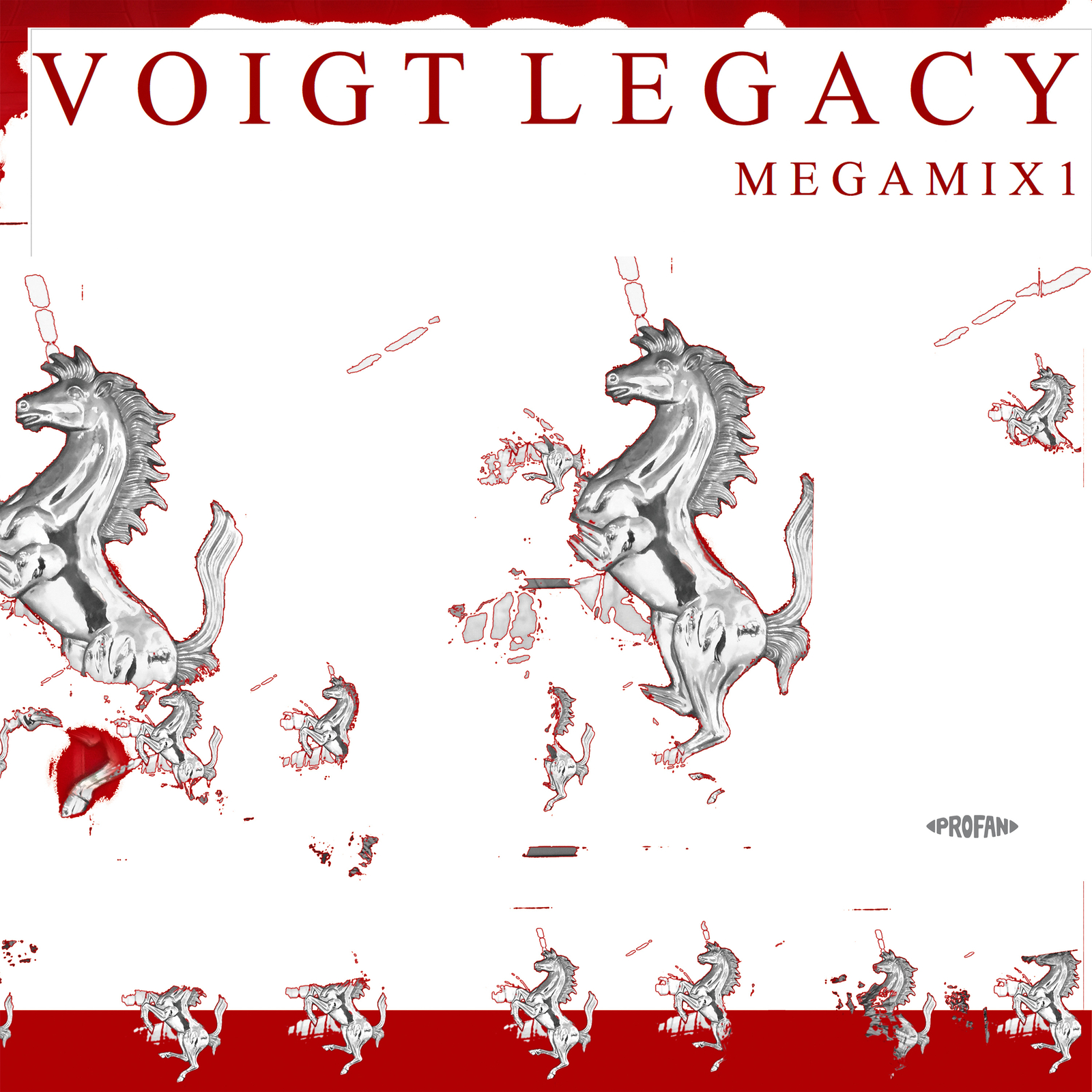 """Voigt Legacy - Megamix 1"" is the promising title of a kind of ""Best-Of Bassdrum-Hits"" from the far-reaching Voigt universe. It is a compact megamix of seven selected tracks from some very rare live sets which have never been released before or never on vinyl. The mix features all-time classics such as ""Fackeln Im Sturm"" and ""W.I.R."" as well as the long-out-of-print super-smasher ""Die Schallplatte"" and gems from the Protest catalogue such as ""Du Musst Nichts Sagen"" and ""Sound & Vision"". This multifaceted collection of danceable tracks and looped horses is presented in a deluxe cover with glossy colours. The art bridge is a natural choice because where there's a loop there's a way. An abstract loop collage measuring 600 cm x 150 cm was created under the same title ""Voigt Legacy – Megamix 1"" corresponding to the music and referencing the graphic symbolism of the titles logos and cover artwork."